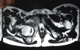 Radiological evaluation was done in the form of X-ray and MRI. X-ray of the pelvis with both hip joints (Figure 2) showed inferior dislocation of the femur with features suggestive of avascular necrosis of the head of the femur and flattening of the weight bearing dome of the acetabulum. MRI (Figure 3) showed a similar picture with conformation of antero-inferior dislocation of hip. The patient was advised total hip replacement and all pre-operative investigations were within normal limits.