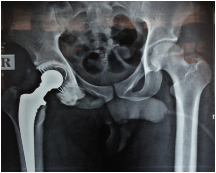 For the surgical procedure, lateral position and posterior approach was used. Intra-operatively the head of femur and acetabulum were both devoid of the cartilage, their weight-bearing surfaces were damaged and the cavity was filled with fibrous tissue. After adequate preparation of the acetabulum and femoral shaft, reversed hybrid total hip replacement was done. The patient was started on static and active quadriceps exercises post-operatively after anesthesia wore off.