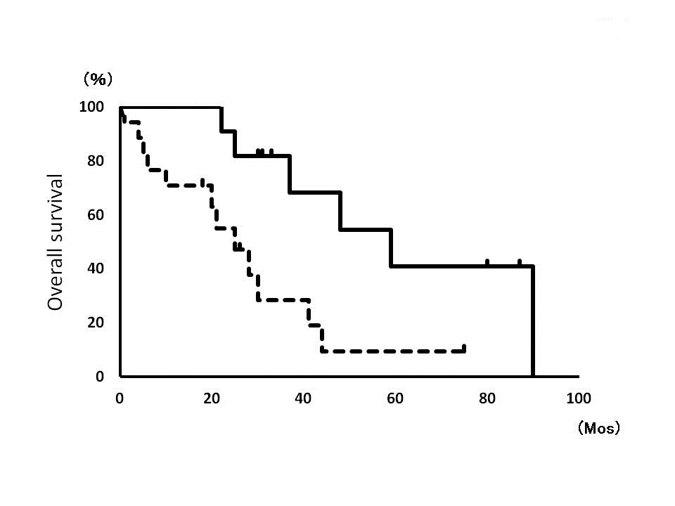 Fig. 2: Overall survival curves of low-EOD group (solid line) and high-EOD group (dotted line).